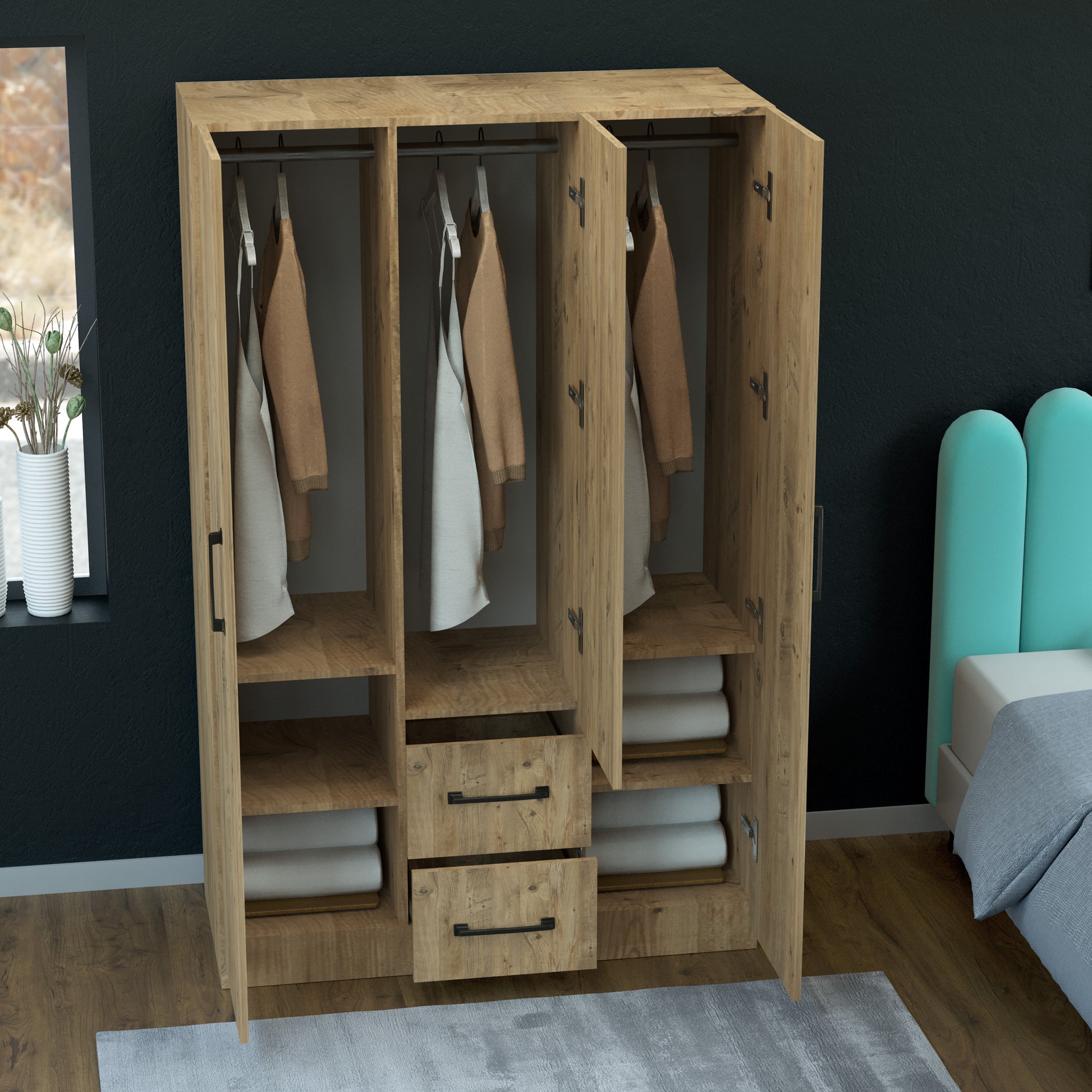 Perlomi 4 Kapaklı 4 Raflı Gardırop kullanım kolaylığı ve modern görünüm sayesinde evinize şıklık katar.